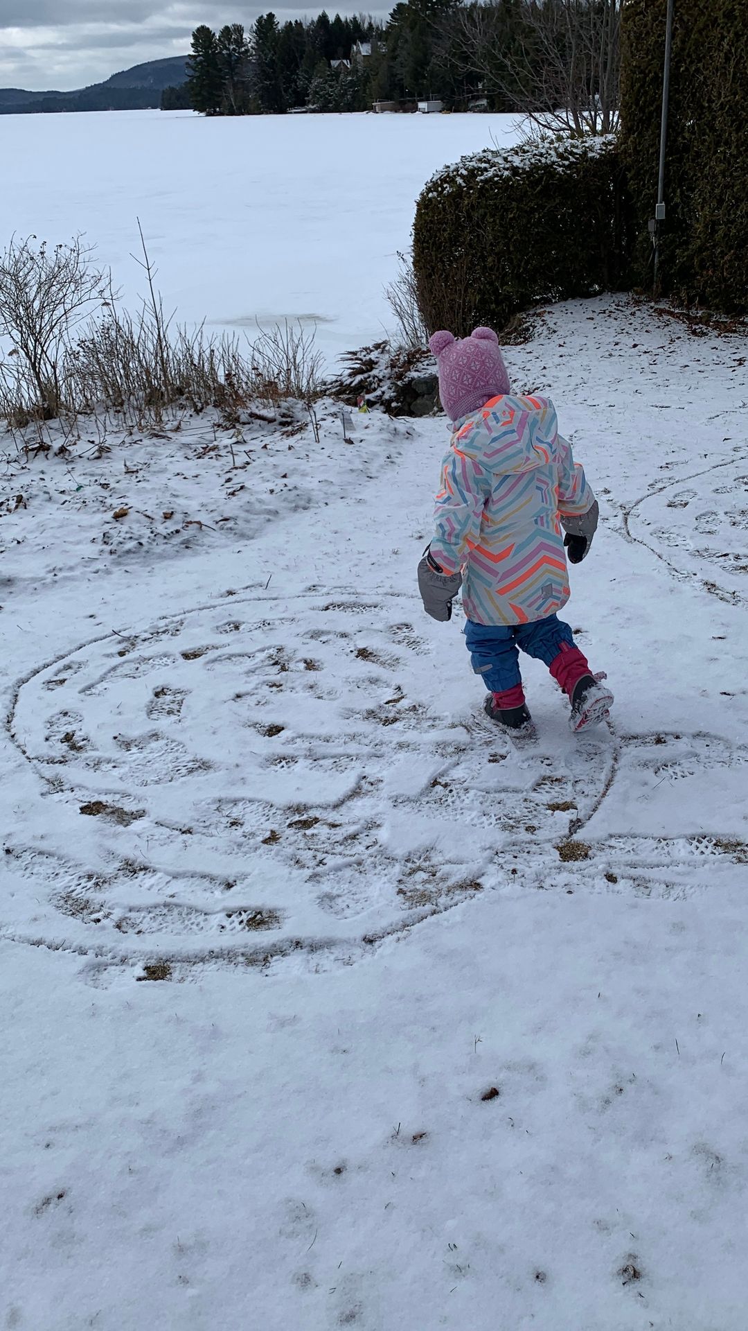 Dans la neige, tracez une grande spirale et invitez votre enfant à la suivre en marchant ou en la retraçant avec un bâton.