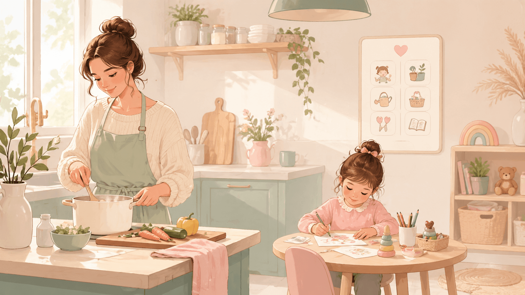 Télécharge 10 idées sans écran pendant que maman cuisine et teste une première routine simple avec ton enfant.